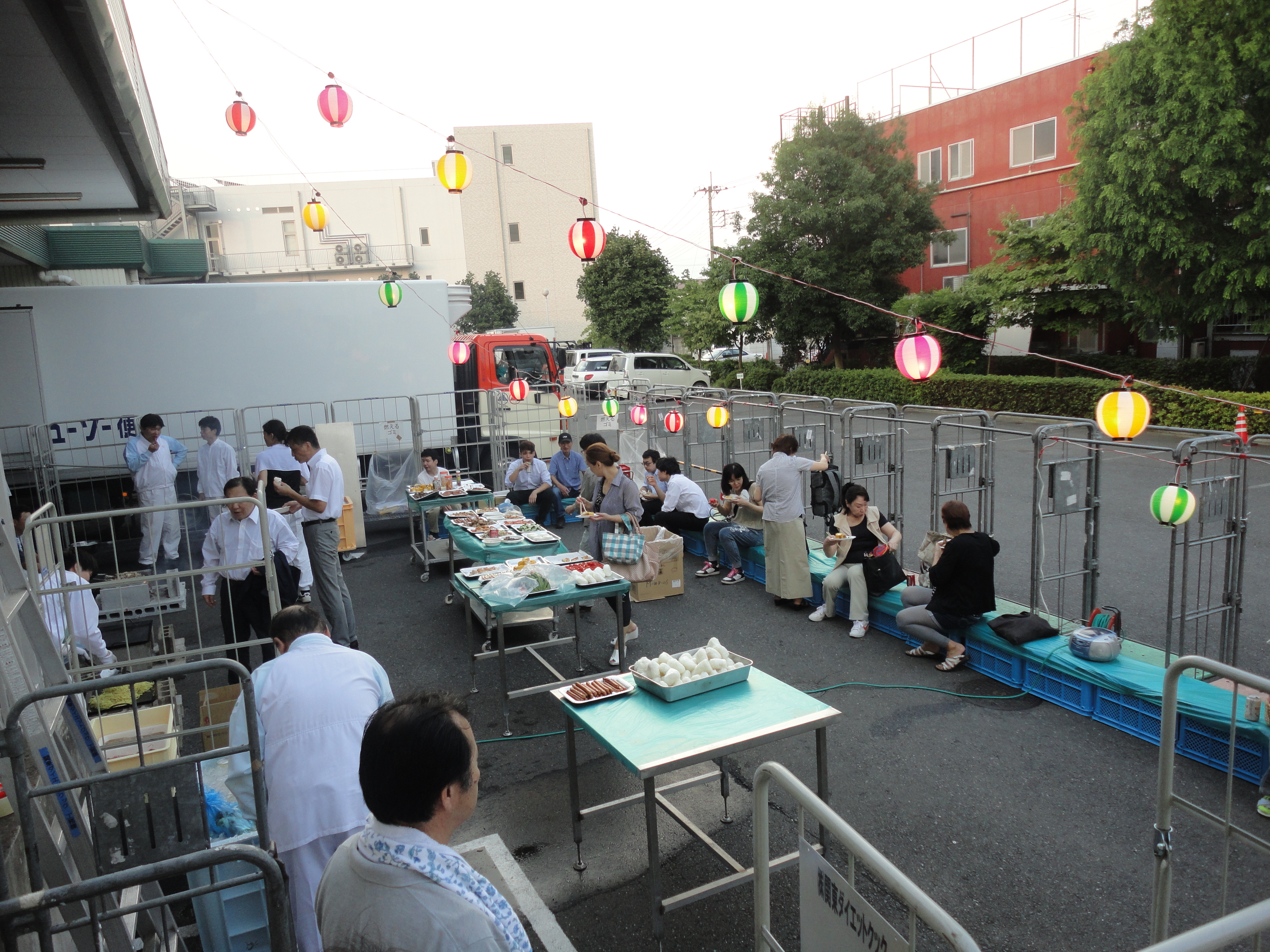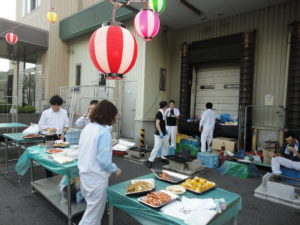 暑気払いBBQ 弊社派遣先の食品工場で暑気払いのバーベキュー大会が開催されました。 暑い中ご準備お疲れ様です。本当にありがとうございます。 仕事を終えて、続々と参加者が集まります。 お腹も心も満足!ごちそうさまです。 夏バテに負けないように、しっかり食べて明日からまたがんばります。 提灯がムードを盛り上げていますね。みんな楽しそうです。